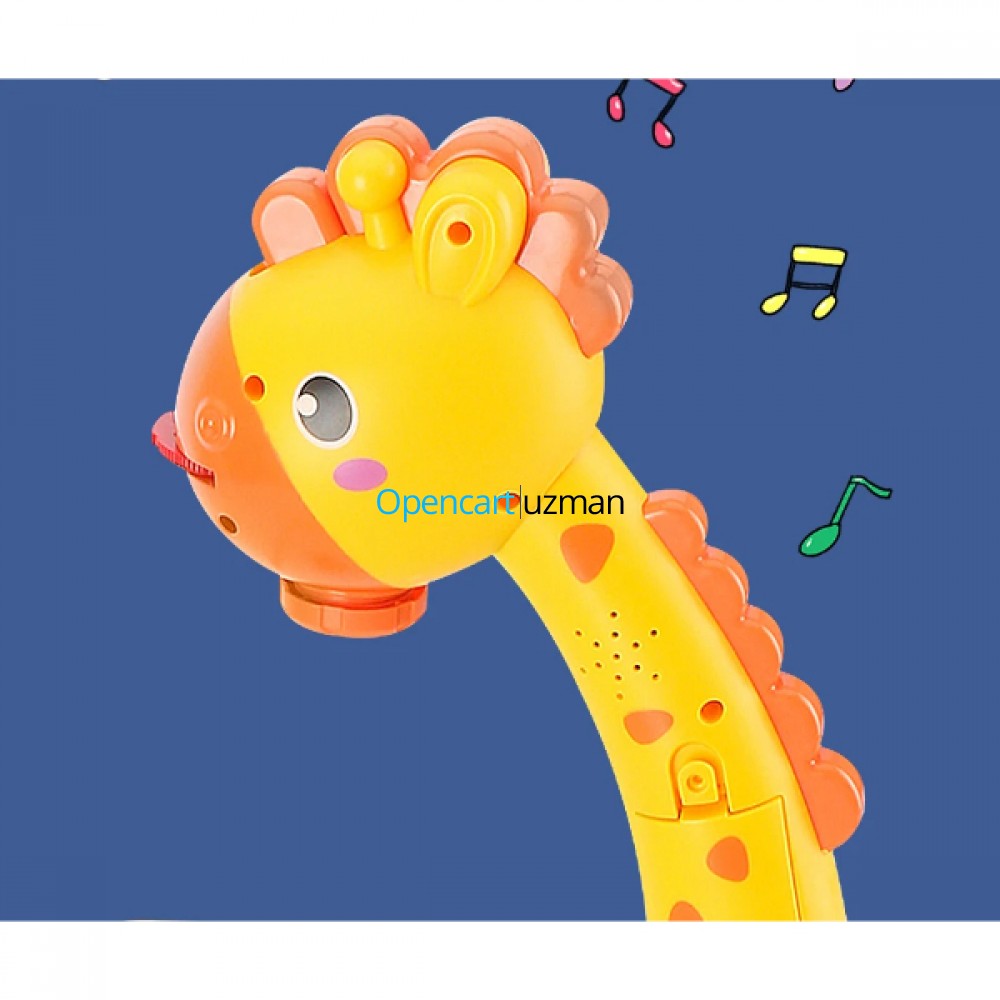 Çocukların hayal gücünü ve el becerilerini geliştirmek için tasarlanmış zürafa figürlü projeksiyonlu boyama tahtası, eğlenceli ve öğretici bir oyun deneyimi sunar. Zürafa şeklindeki projeksiyon cihazı farklı görselleri masanın üzerine yansıtarak çocukların kolayca boyama yapmalarına yardımcı olur. Su ile nemlendirilerek kolayca silinebilir. Kendi içerisindeki müzik özelliği ile boyama yaparken çocukların müzik dinleyerek eğlenceli vakit geçirmelerini sağlar. Set içerisinde 12 adet renkli kalem, 3 farklı projeksiyon slaytı (renkler karışık), 1 adet silgi aparatı ve 1 adet çizim defteri yer alır. Dayanıklı plastik malzemeden üretilmiştir. 38 cm yükseklik, 29,5 cm genişlik ve 25 cm derinlik ölçülerindedir.
