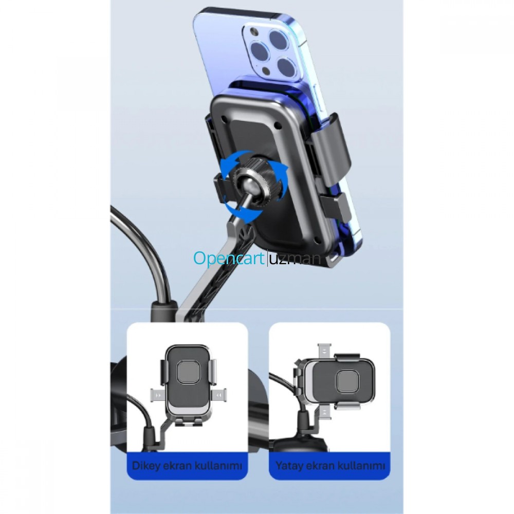 360° dönebilen dikiz aynası bisiklet ve motosiklet telefon tutucu, hem yatay hem de dikey kullanım imkanı sağlayan esnek başlığıyla cihazınızı ideal görüş açısında sabitlemenize olanak tanır. Dayanıklı ve sert plastikten üretilmiş yapısı, uzun ömürlü kullanım sunarken, ayarlanabilir mekanizması sayesinde dikiz aynası gibi boru tipi alanlara kolayca monte edilebilir. Yanlardan kavrayan sabitleyici kollar, telefonunuzu güçlü şekilde tutarak sürüş sırasında sarsıntılarda düşmesini engeller. Silikon destek pedleri, cihazınızın kaymasını ve çizilmesini önler. Modern ve ergonomik tasarımı sayesinde motosiklet, bisiklet ve elektrikli scooter kullanıcıları için güvenli ve kullanışlı bir çözümdür.