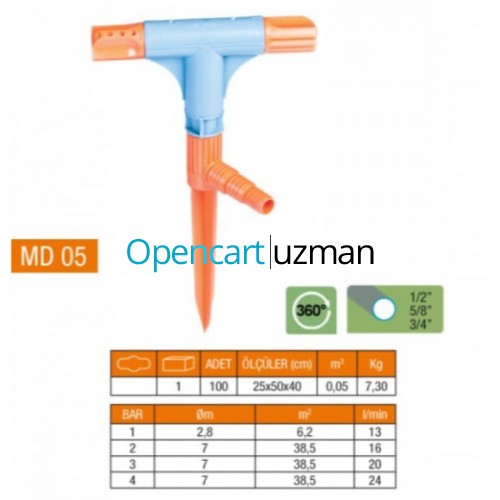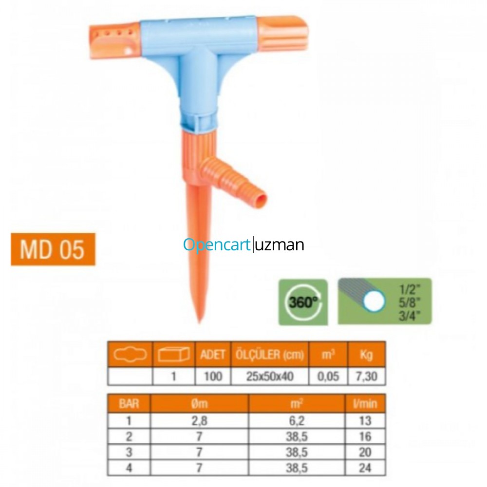 2 yönlü & T normal sprink fıskiye, 360 derece dönebilen başlık yapısıyla bahçe ve tarım alanlarında eşit sulama sağlar. T şeklindeki tasarımı sayesinde çift yönlü su püskürtme yaparak geniş alanları kısa sürede sulayabilir. 1/2", 5/8" ve 3/4" hortum çaplarına uyumlu bağlantısı sayesinde yaygın hortum sistemleriyle rahatlıkla kullanılabilir. Dayanıklı plastik malzemeden üretilmiş olup dış ortam koşullarına karşı uzun ömürlü kullanım sunar. 25x50x40 cm ölçülerindedir ve toprağa saplanarak sabitlenebilir. Farklı bar seviyelerinde ortalama 2,8 ila 7 metre arasında püskürtme mesafesi sağlar. Bahçeler, sebze alanları ve geniş çim yüzeyler için idealdir.