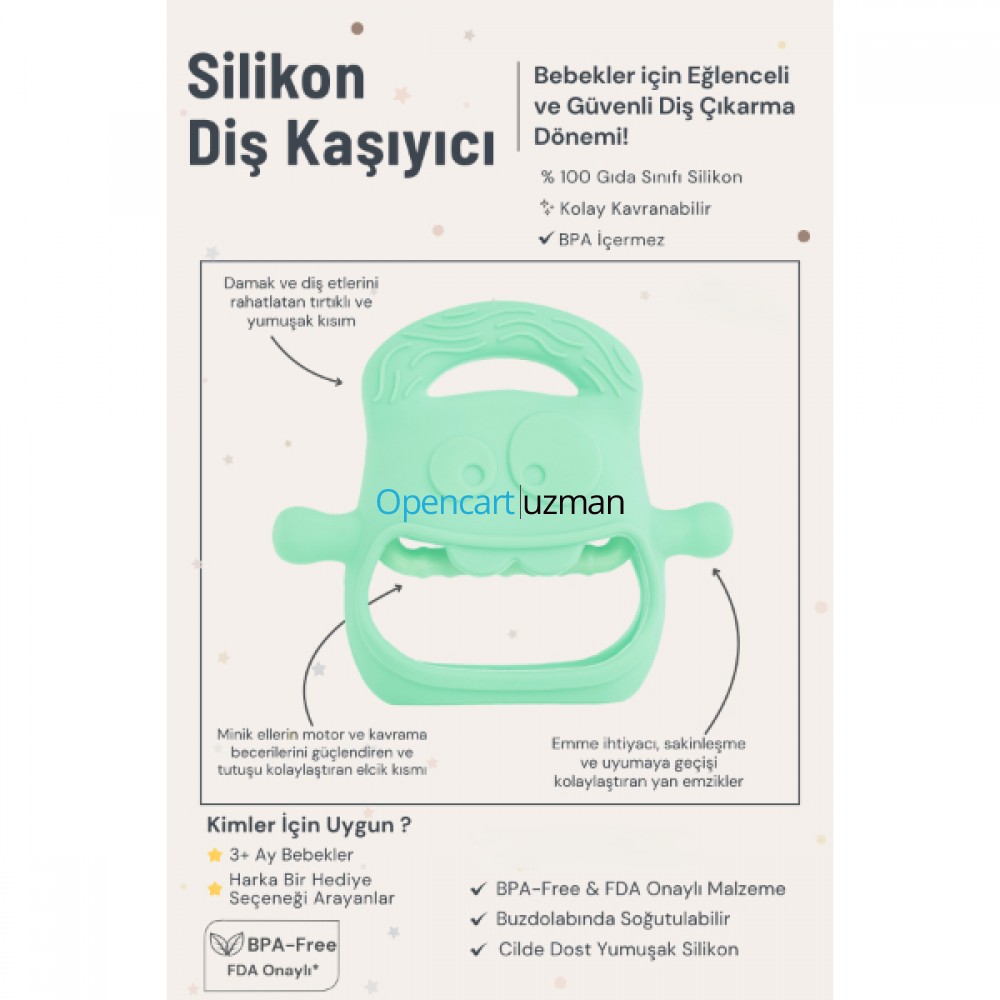 ChatGPT:AÇIK YEŞİL BEBEK SİLİKON DİŞ KAŞIYICIÜrün ÖzellikleriAçık yeşil silikon bebek diş kaşıyıcı, bebeklerin diş çıkarma sürecini güvenli ve konforlu hale getirir. Sevimli ve modern tasarımı, farklı dokulara sahip yüzeyleri ve ergonomik tutma alanları sayesinde minik eller için kolay kavrama sağlar. Hassas diş etlerine nazikçe masaj yaparak bebeklere huzurlu bir rahatlama sunar.Çift yönlü emzik kolları, doğal emme refleksini desteklerken parmak emme alışkanlığını azaltmaya yardımcı olur. Aynı zamanda çene kaslarını çalıştırarak ağız ve çene gelişimini teşvik eder. Hafif ve esnek yapısı, bebeklerin kendi başına kolayca tutabilmesini sağlar.Diş kaşıyıcı yalnızca rahatlatıcı bir ürün değil, aynı zamanda motor ve duyusal gelişimi destekleyen bir oyun arkadaşıdır. Çeşitli tutma bölgeleri bebeğin kavrama becerilerini artırırken, yumuşak silikon yüzeyi dokunsal keşfi destekler. %100 gıda sınıfı silikon malzemeden üretilmiş olup BPA, BPS ve zararlı kimyasallar içermez. Yenidoğan döneminden itibaren güvenle kullanılabilir.Paket İçeriği1 adet Açık Yeşil Bebek Silikon Diş Kaşıyıcı 1 adetChatGPT:AÇIK YEŞİL BEBEK SİLİKON DİŞ KAŞIYICIÜrün ÖzellikleriAçık yeşil silikon bebek diş kaşıyıcı, bebeklerin diş çıkarma sürecini güvenli ve konforlu hale getirir. Sevimli ve modern tasarımı, farklı dokulara sahip yüzeyleri ve ergonomik tutma alanları sayesinde minik eller için kolay kavrama sağlar. Hassas diş etlerine nazikçe masaj yaparak bebeklere huzurlu bir rahatlama sunar.Çift yönlü emzik kolları, doğal emme refleksini desteklerken parmak emme alışkanlığını azaltmaya yardımcı olur. Aynı zamanda çene kaslarını çalıştırarak ağız ve çene gelişimini teşvik eder. Hafif ve esnek yapısı, bebeklerin kendi başına kolayca tutabilmesini sağlar.Diş kaşıyıcı yalnızca rahatlatıcı bir ürün değil, aynı zamanda motor ve duyusal gelişimi destekleyen bir oyun arkadaşıdır. Çeşitli tutma bölgeleri bebeğin kavrama becerilerini artırırken, yumuşak silikon yüzeyi dokunsal keşfi destekler. %100 gıda sınıfı silikon malzemeden üretilmiş olup BPA, BPS ve zararlı kimyasallar içermez. Yenidoğan döneminden itibaren güvenle kullanılabilir.Paket İçeriği1 adet