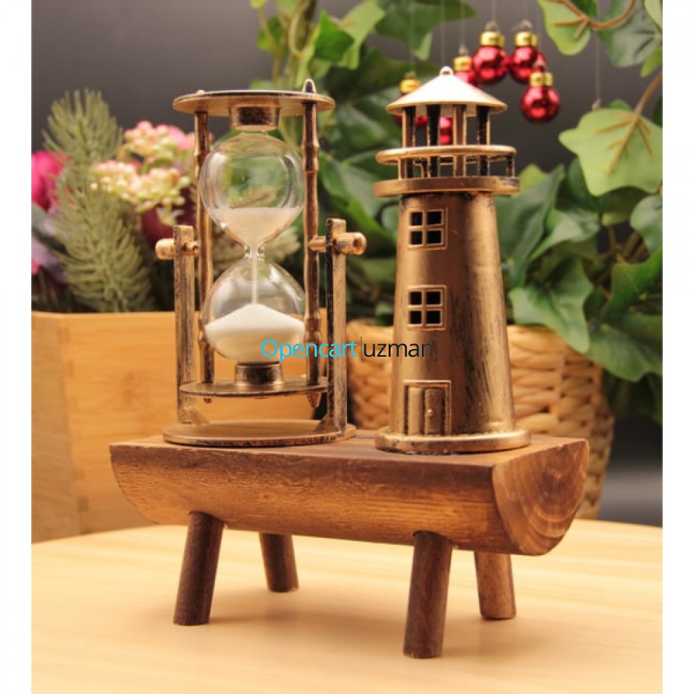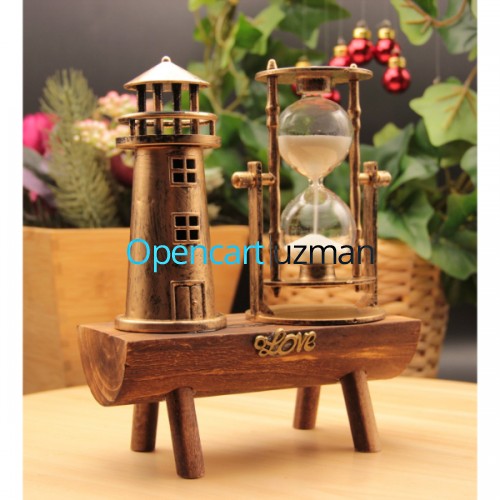 Deniz feneri biblolu kum saati, deniz temalı nostaljik tasarımıyla dikkat çeken dekoratif bir masa süsüdür. Metalik altın renkteki deniz feneri detayı ve şeffaf cam kum saati, ahşap görünümlü platform üzerinde bir araya getirilerek estetik bir bütünlük oluşturur. Üzerindeki “Love” yazısı ürüne romantik bir dokunuş katarken, retro görünümü sayesinde her ortamda şık bir atmosfer yaratır. Ofis, ev veya hediye alternatifi olarak değerlendirilebilir. El işçiliği hissi veren yüzeyi ve zarif detayları ile koleksiyonluk bir parçadır.