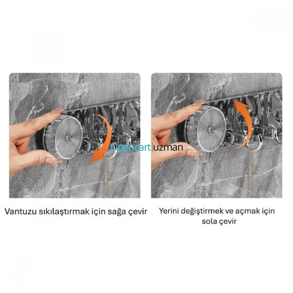 GÜÇLÜ LÜKS VANTUZLU ASKILIKÜrün ÖzellikleriGüçlü vantuz sistemiyle donatılmış bu şeffaf askılık, özellikle banyo, mutfak ve dolap içlerinde kullanıma uygundur. Delme veya yapıştırma işlemi gerektirmeden düz yüzeylere kolayca monte edilir. Şeffaf ve dayanıklı plastikten üretilmiştir. Vantuzu sağa çevirerek sabitlenir, sola çevirerek ise kolayca çıkarılır. Doğru sabitlendiğinde orta ağırlıktaki eşyaları rahatlıkla taşıyabilir. Üzerinde yer alan çoklu kancalar sayesinde aynı anda birden fazla havlu, mutfak gereci ya da aksesuar asılabilir. Duvar yüzeyinde iz bırakmadan çıkarılabilir ve farklı alanlara taşınabilir. Hem pratik kullanımı hem de estetik tasarımı sayesinde ev düzenleme ihtiyaçlarında fonksiyonel bir çözümdür.