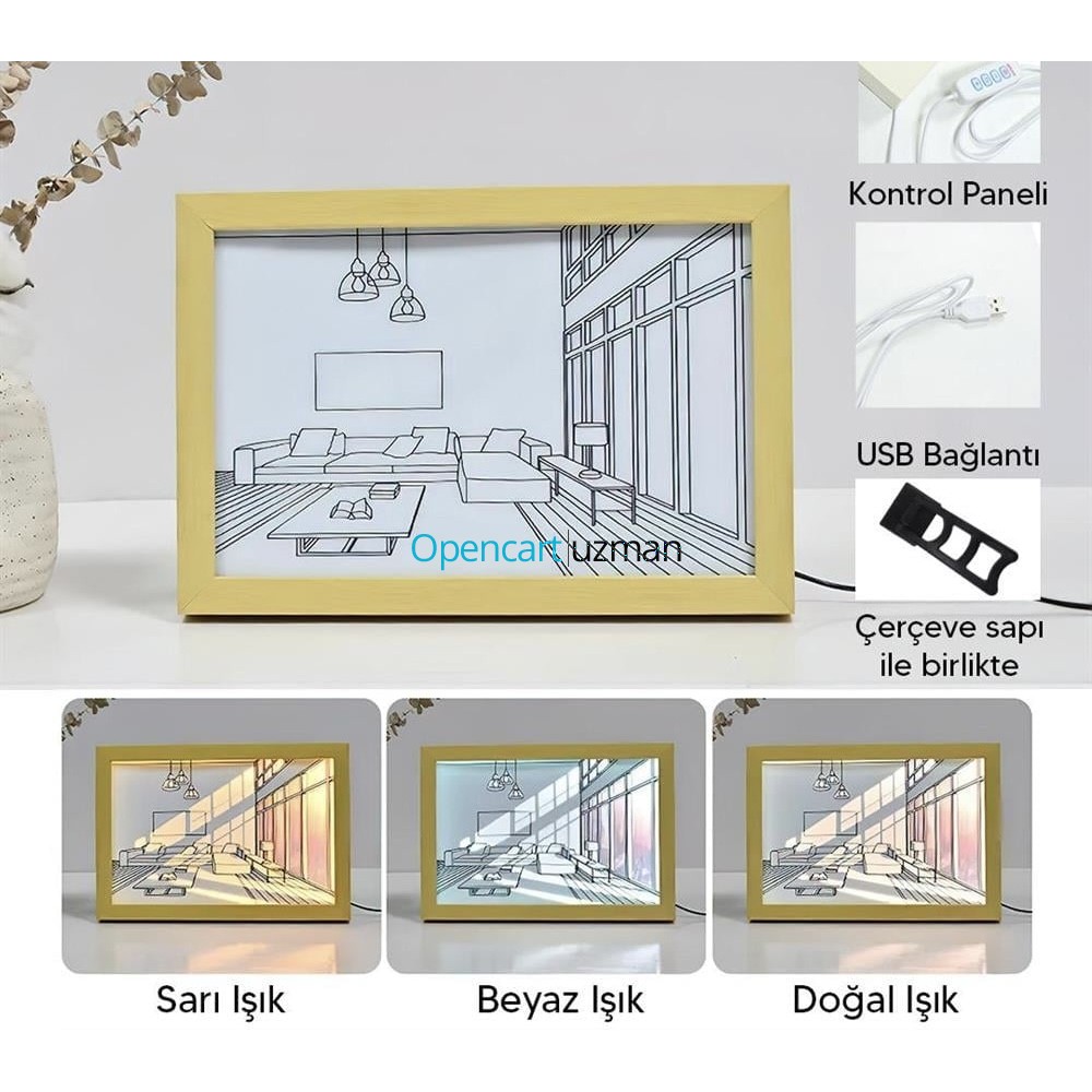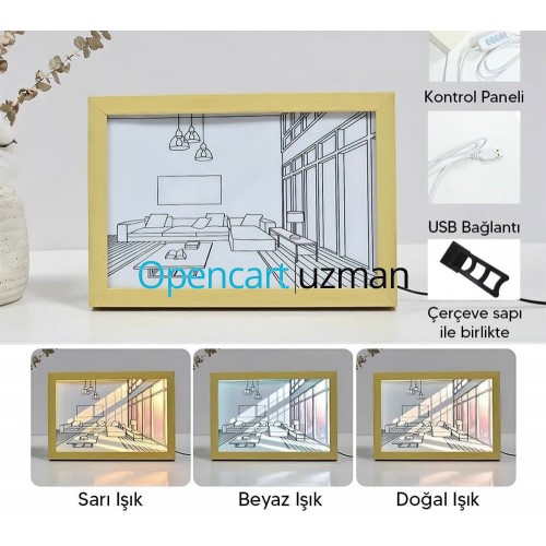 IŞIKLI RETRO TABLOMasa Üstünde Estetik Bir DokunuşIşıklı Tablo, estetik bir atmosfer oluşturmak için tasarlanmış özel bir üründür. Masa üstünde kullanılabilecek boyutuyla, herhangi bir masa veya sehpa üzerine kolayca yerleştirilebilir. Çerçevenin arkasında bulunan ayak sayesinde dik bir şekilde durur ve odanıza zarif bir dokunuş katar. Tablo, kara kalem çizim tarzında bir oturma odasının görüntüsünü sunar ve bu sayede herhangi bir alana nostaljik bir hava katar. İUSB bağlantısı aracılığıyla elektrik alır ve çerçevenin kenarlarından çıkan ışık, oturma odasına vurarak gerçek ve retro bir oda görüntüsü oluşturur. Bu etkileyici aydınlatma efekti, odanızı sıcak ve davetkar bir atmosfere dönüştürür, misafirlerinizi büyüler ve dekorasyonunuza benzersiz bir dokunuş katar. Işıklı Tablo, evinizi süslemek ve atmosferini zenginleştirmek için mükemmel bir seçenektir, estetik ve işlevsellik bir arada sunar.Paket İçeriği1 adet ışıklı retro tablo