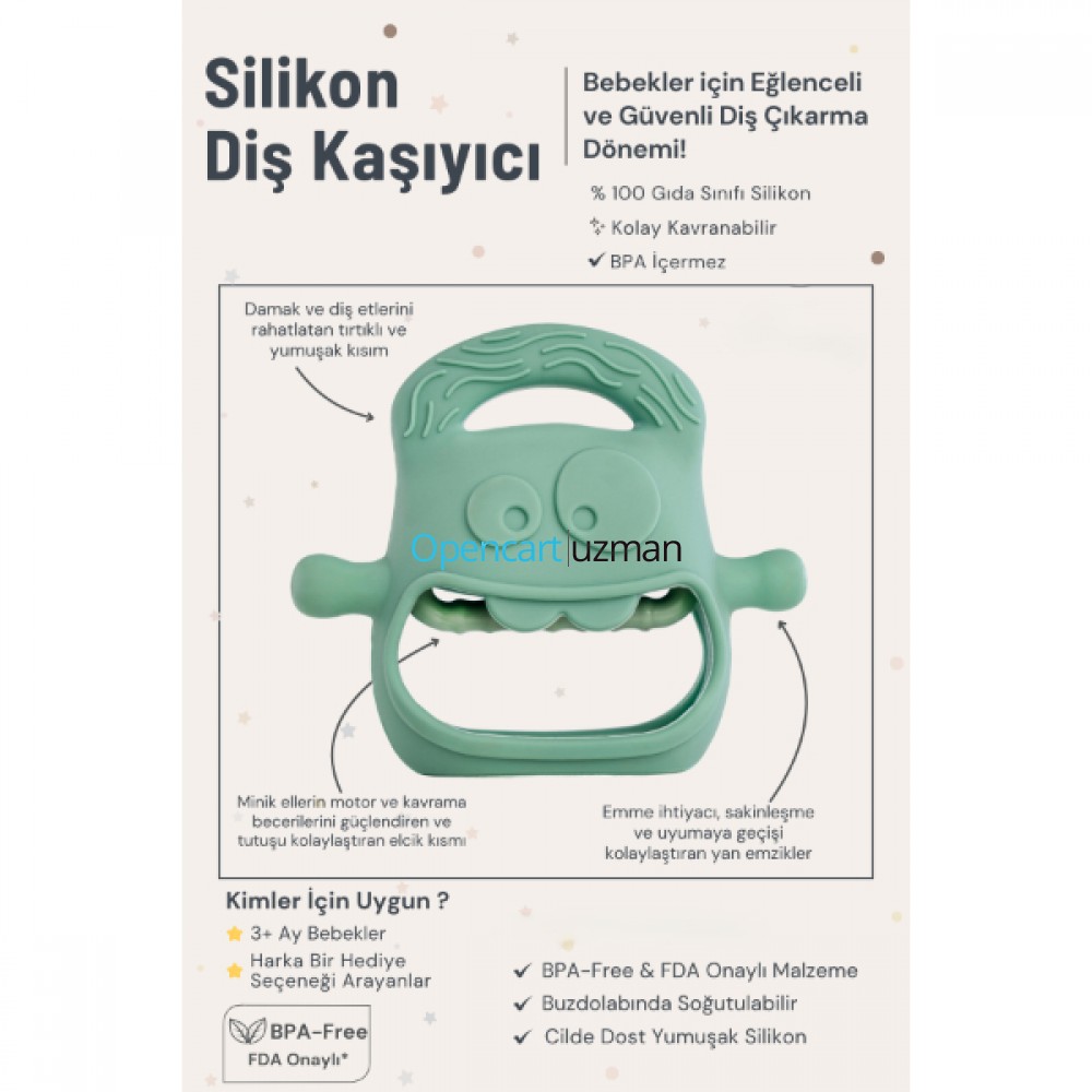 Koyu yeşil silikon bebek diş kaşıyıcı, diş çıkarma döneminde bebeklere hem rahatlatıcı hem de eğlenceli bir deneyim sunar. Modern tasarımı, farklı dokulara sahip yüzeyleri ve ergonomik tutma alanları sayesinde minik eller için kolay kavranabilir yapıdadır. Hassas diş etlerini nazikçe masaj yaparak yatıştırır ve bebeklerin sakinleşmesine yardımcı olur.Çift yönlü emzik kolları, bebeklerde doğal emme refleksini desteklerken parmak emme alışkanlığının önüne geçer. Aynı zamanda çene kaslarını çalıştırarak ağız ve çene gelişimine katkı sağlar. Hafif ve esnek yapısı ile bebekler kolayca tutabilir.Bu diş kaşıyıcı yalnızca rahatlatıcı değil, aynı zamanda motor ve duyusal gelişimi destekleyen bir oyun arkadaşıdır. Farklı yüzey dokuları dokunsal keşfi teşvik ederken kavrama becerisini geliştirir. Gıda sınıfı medikal silikon malzemeden üretilmiş olup BPA, BPS ve zararlı kimyasallar içermez. Yeni doğan döneminden itibaren güvenle kullanılabilir.